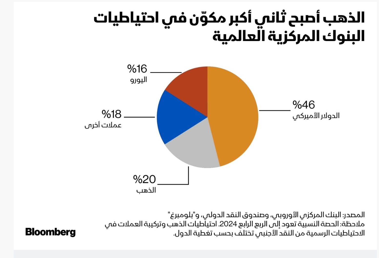 وفقاً لتقييم سنوي صادر عن البنك المركزي الأوروبي بشأن المكانة العالمية لليورو، فقد بلغت حصة الذهب في الاحتياطيات الأجنبية العالمية، بحسب الأسعار السوقية، نحو 20% بنهاية عام 2024، متجاوزاً اليورو الذي تراجعت حصته إلى 16%. في المقابل، واصل الدولار الأميركي تراجعه التدريجي ليبلغ 46% من إجمالي الاحتياطيات العالمية.